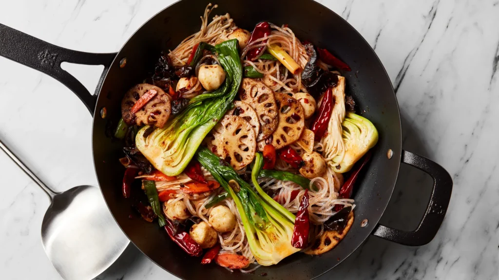 "Our signature stir-fry blend. This classic style involves wok-tossing your ingredients over high heat with a secret mix of dried chilies, Sichuan peppercorns, garlic, and ginger. It delivers the authentic 'Mala' experience—rich, savory, and intensely aromatic without the broth."